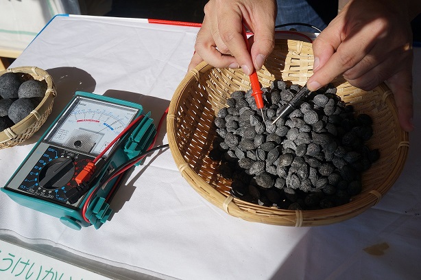 梅の種をそのままの状態(種の内部に仁がある状態)で炭化すると共に炭化形態状況、タール成分などの燃焼成分が存在しないように(燃料としての炭として機能しないように)炭化することによって、5,000Ω以下という低い電気抵抗値(高い通電性)を示すものであった。